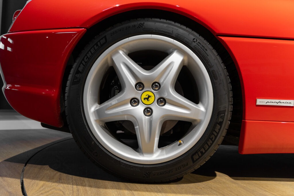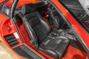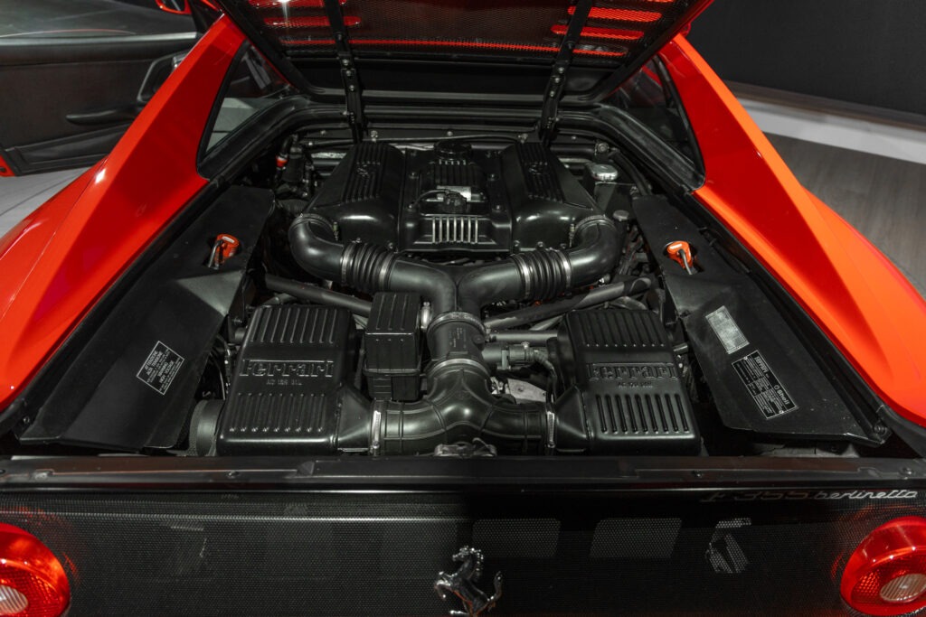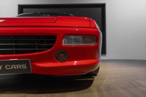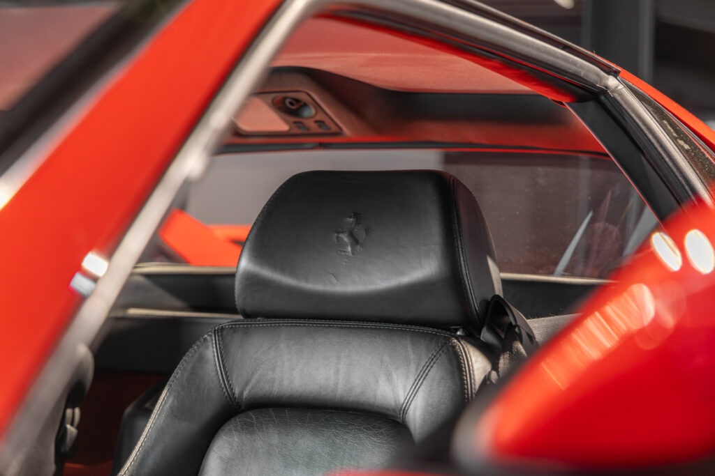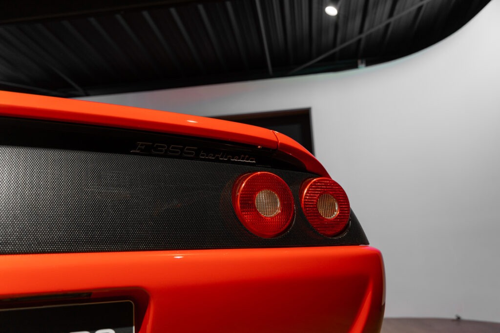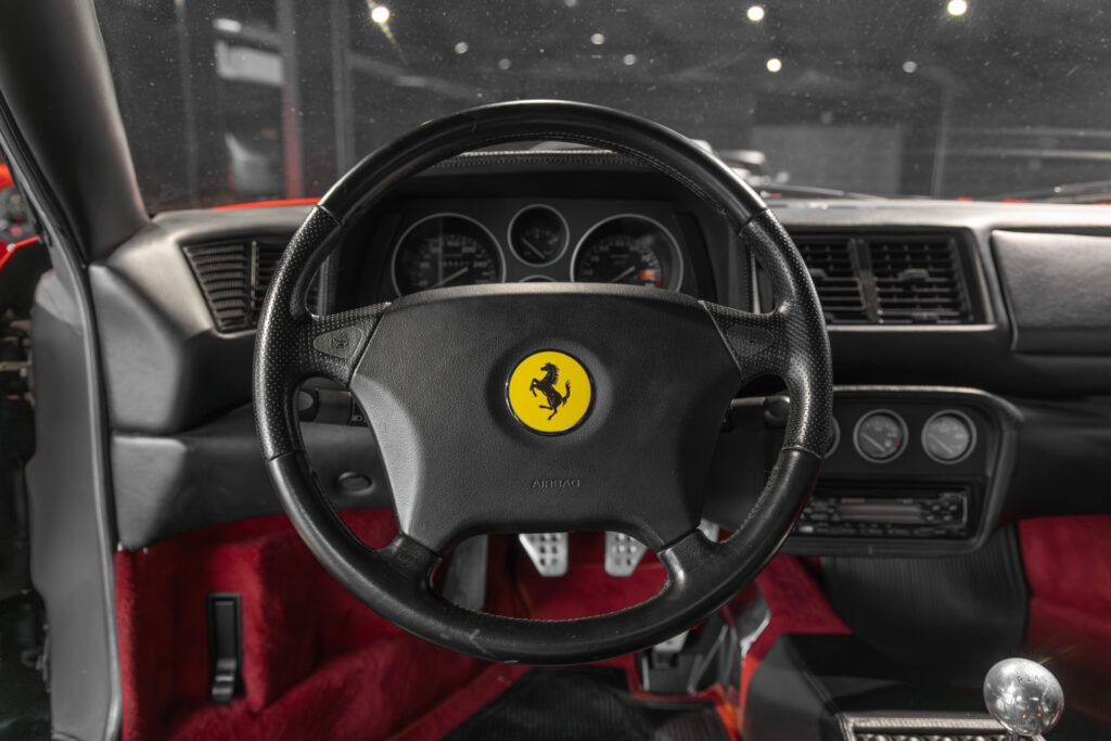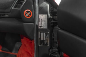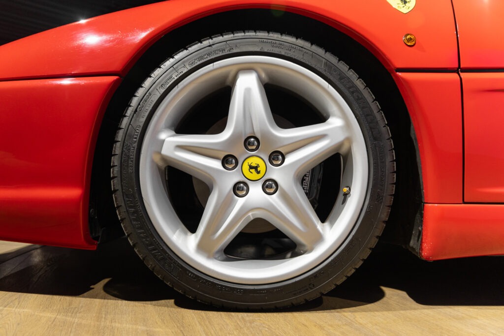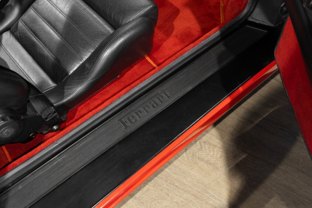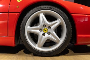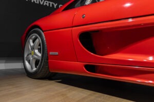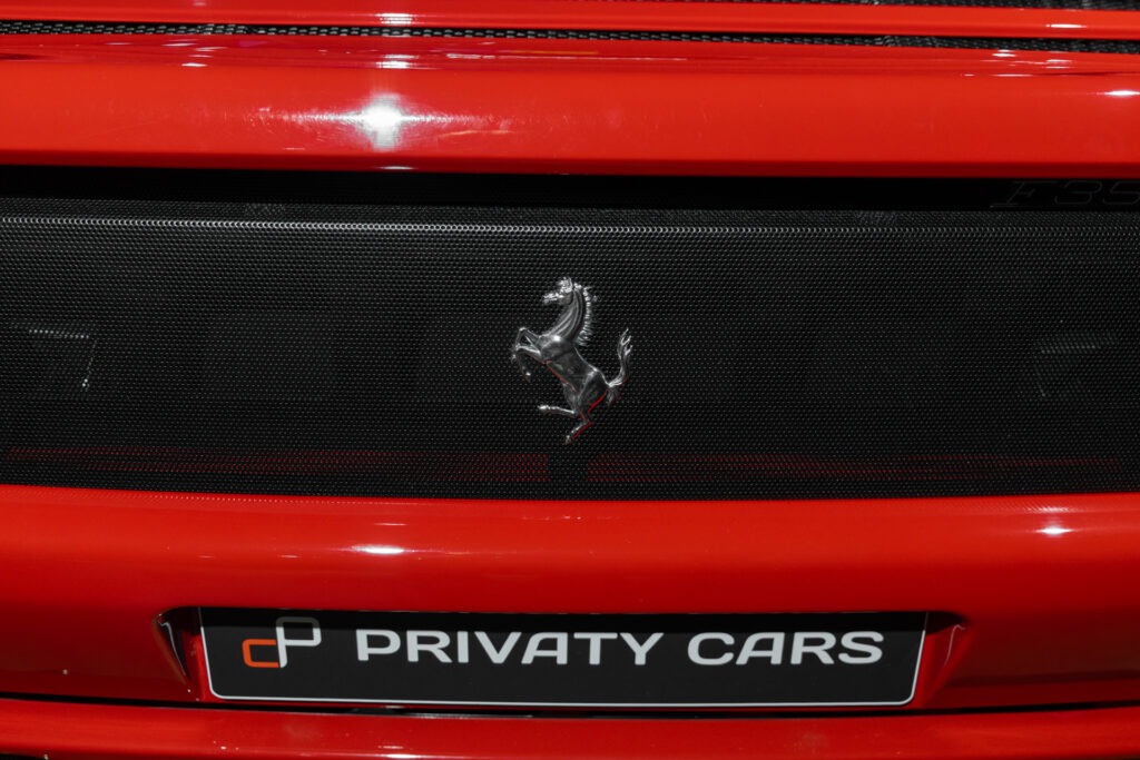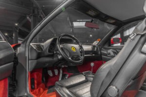 Cette F355 dispose d’équipements en parfaite adéquation avec son esprit sportif et authentique : boîte mécanique pour une expérience de conduite pure et engagée, climatisation pour le confort, volant avec airbag, ainsi que des jantes 18 pouces en magnésium qui participent à ses performances. Elle se distingue également par des éléments emblématiques tels que la grille Challenge, les vitres électriques ou encore le Cavallino gaufré sur les appuis-tête, venant renforcer son caractère iconique et intemporel.