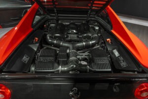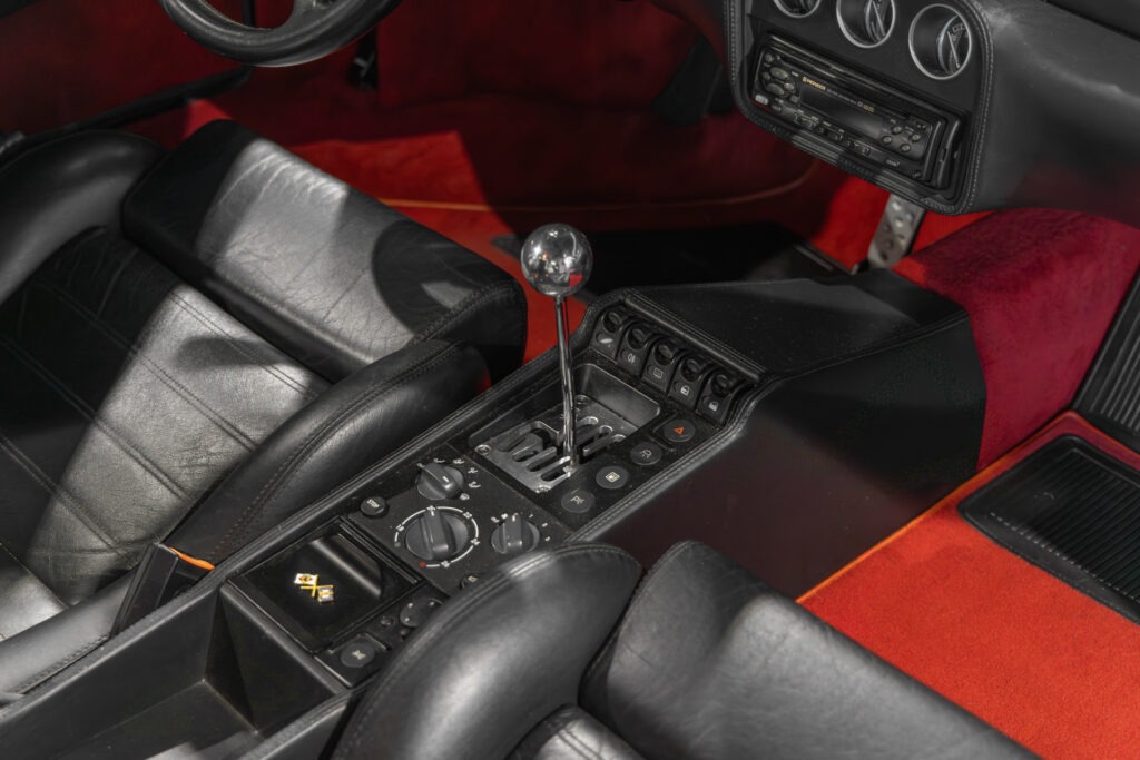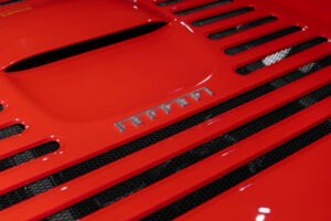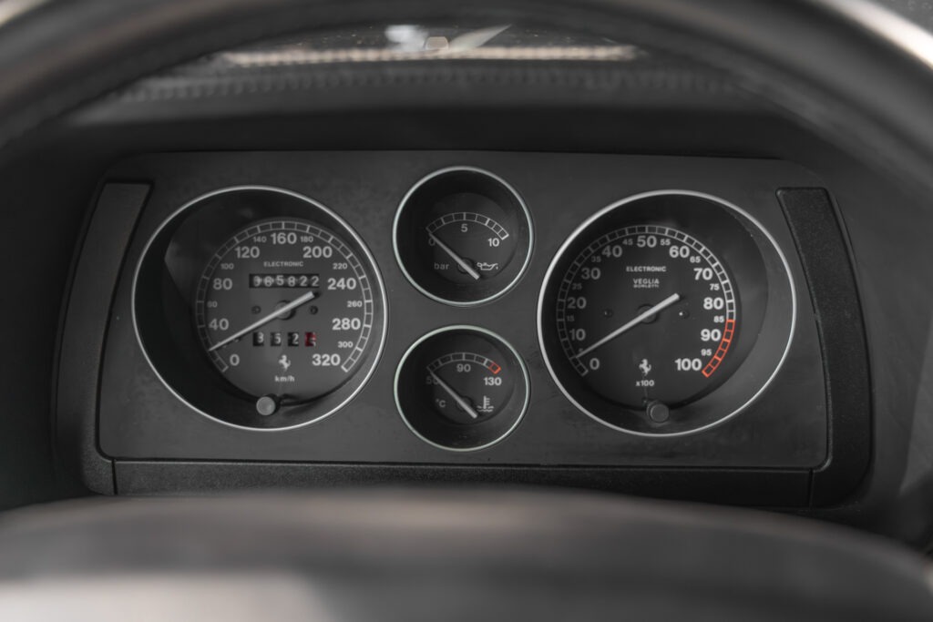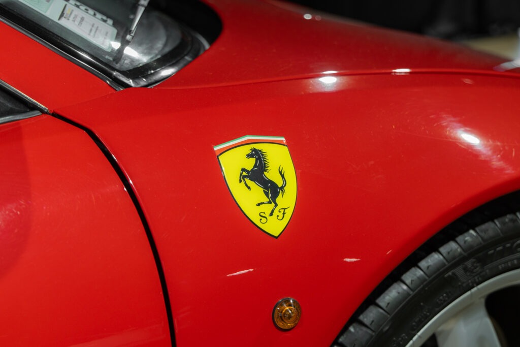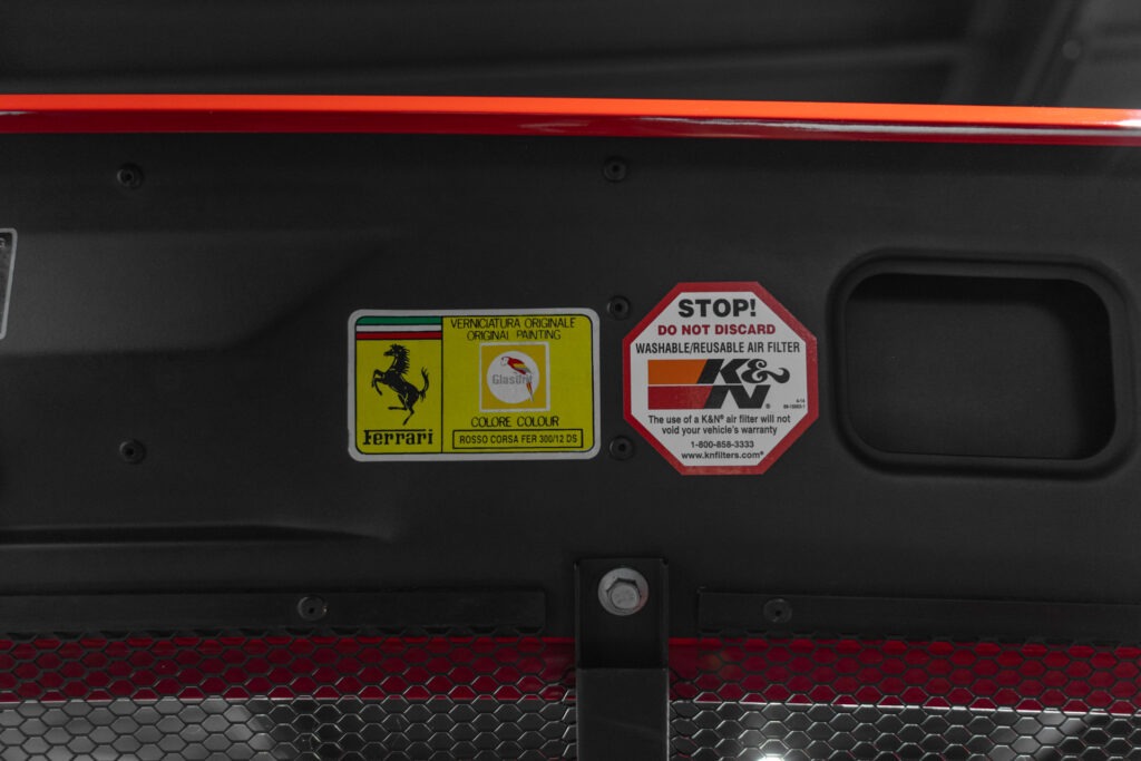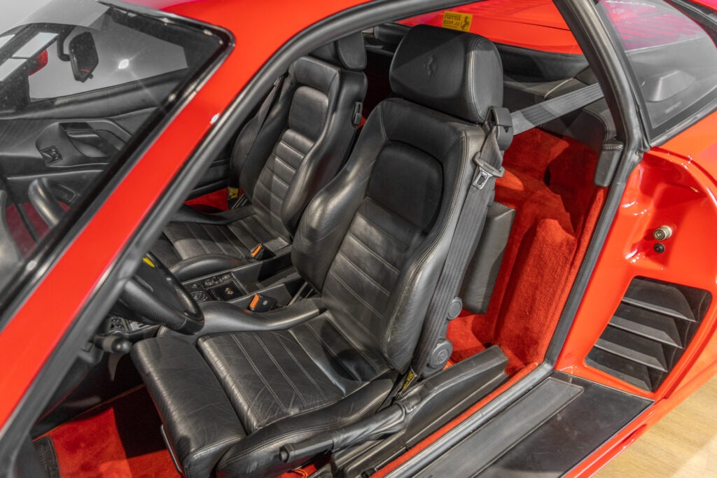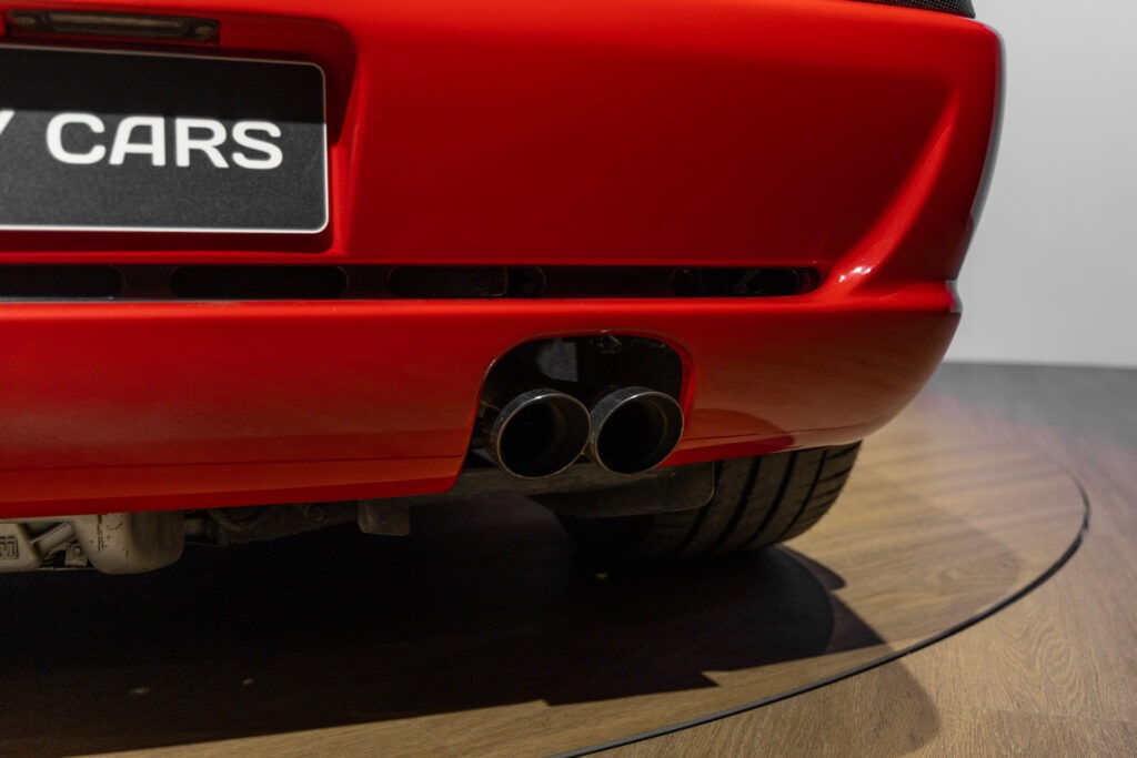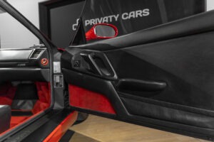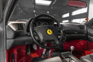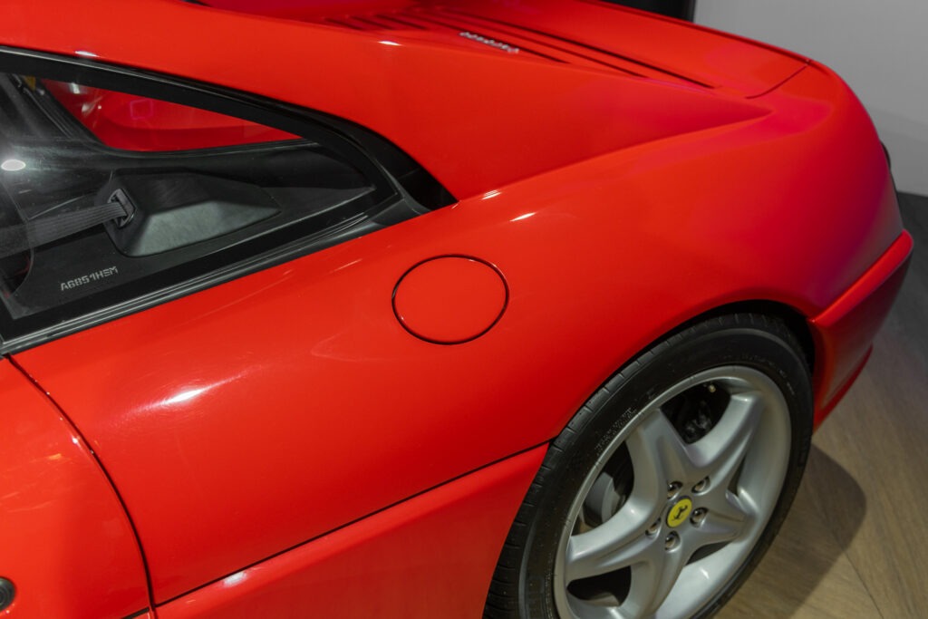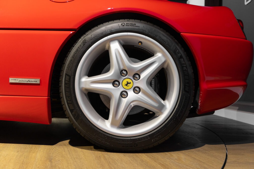 Cette F355 dispose d’équipements en parfaite adéquation avec son esprit sportif et authentique : boîte mécanique pour une expérience de conduite pure et engagée, climatisation pour le confort, volant avec airbag, ainsi que des jantes 18 pouces en magnésium qui participent à ses performances. Elle se distingue également par des éléments emblématiques tels que la grille Challenge, les vitres électriques ou encore le Cavallino gaufré sur les appuis-tête, venant renforcer son caractère iconique et intemporel.